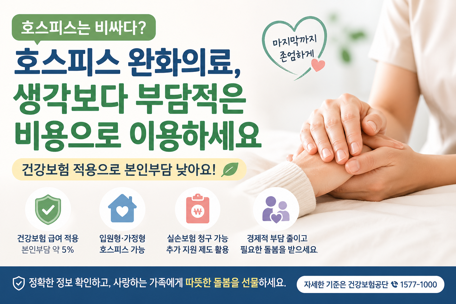 호스피스 완화의료를 이용하고 싶지만 비용이 걱정되어 망설이는 가족들이 많습니다. 제가 호스피스 병동에서 일하면서 느낀 것은, 호스피스 비용에 대한 정확한 정보를 몰라서 이용을 포기하는 경우가 생각보다 많다는 점입니다. 결론부터 말씀드리면, 호스피스 완화의료는 건강보험 급여가 적용되어 일반 병원 입원보다 본인 부담이 훨씬 낮습니다. 특히 암 환자는 산정특례(희귀·중증질환 산정특례 제도)가 적용되면 급여 항목의 본인 부담이 약 5%로 줄어듭니다. 급여 기준과 본인 부담 범위를 정확히 알아두면 비용 걱정 없이 필요한 서비스를 이용할 수 있습니다.
